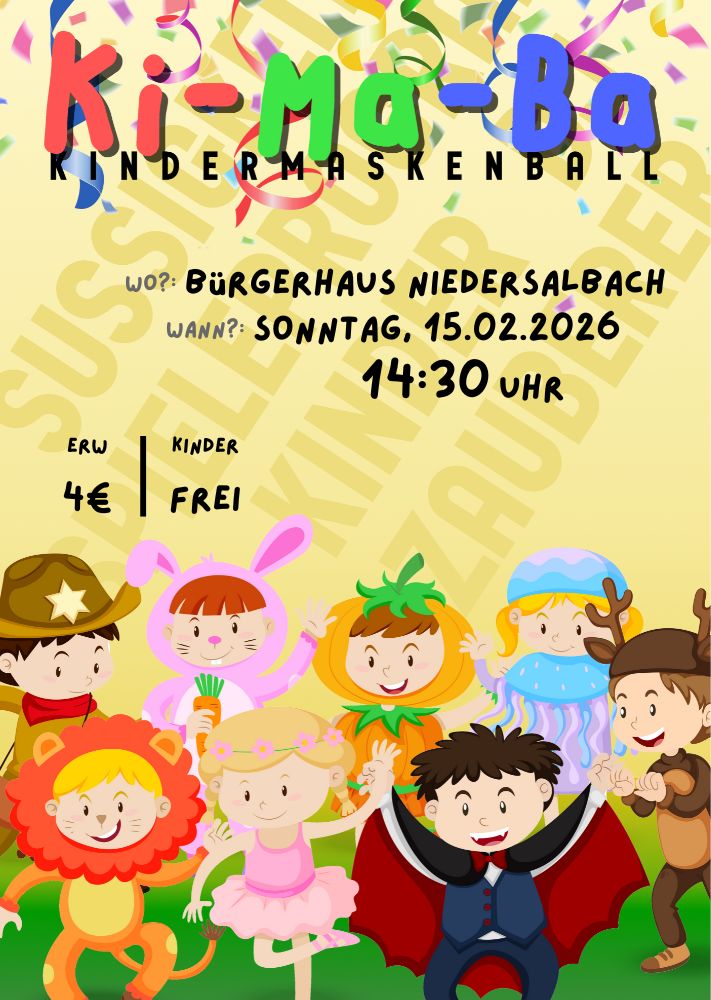 Unser alljährlicher Kinder- und Familienmaskenball im Bürgerhaus Niedersalbach findet am Sonntag, den 15. Februar, ab 14.30 Uhr statt.
